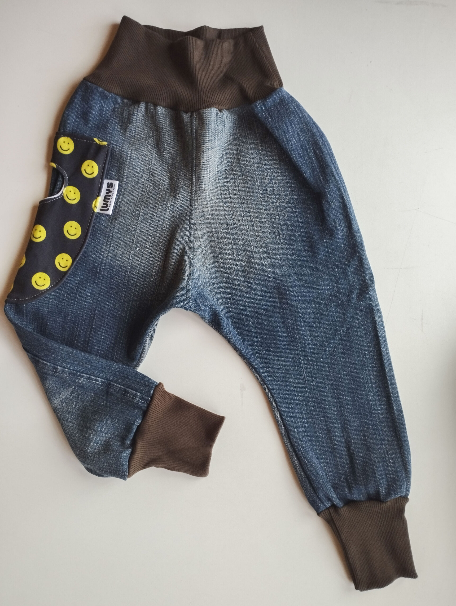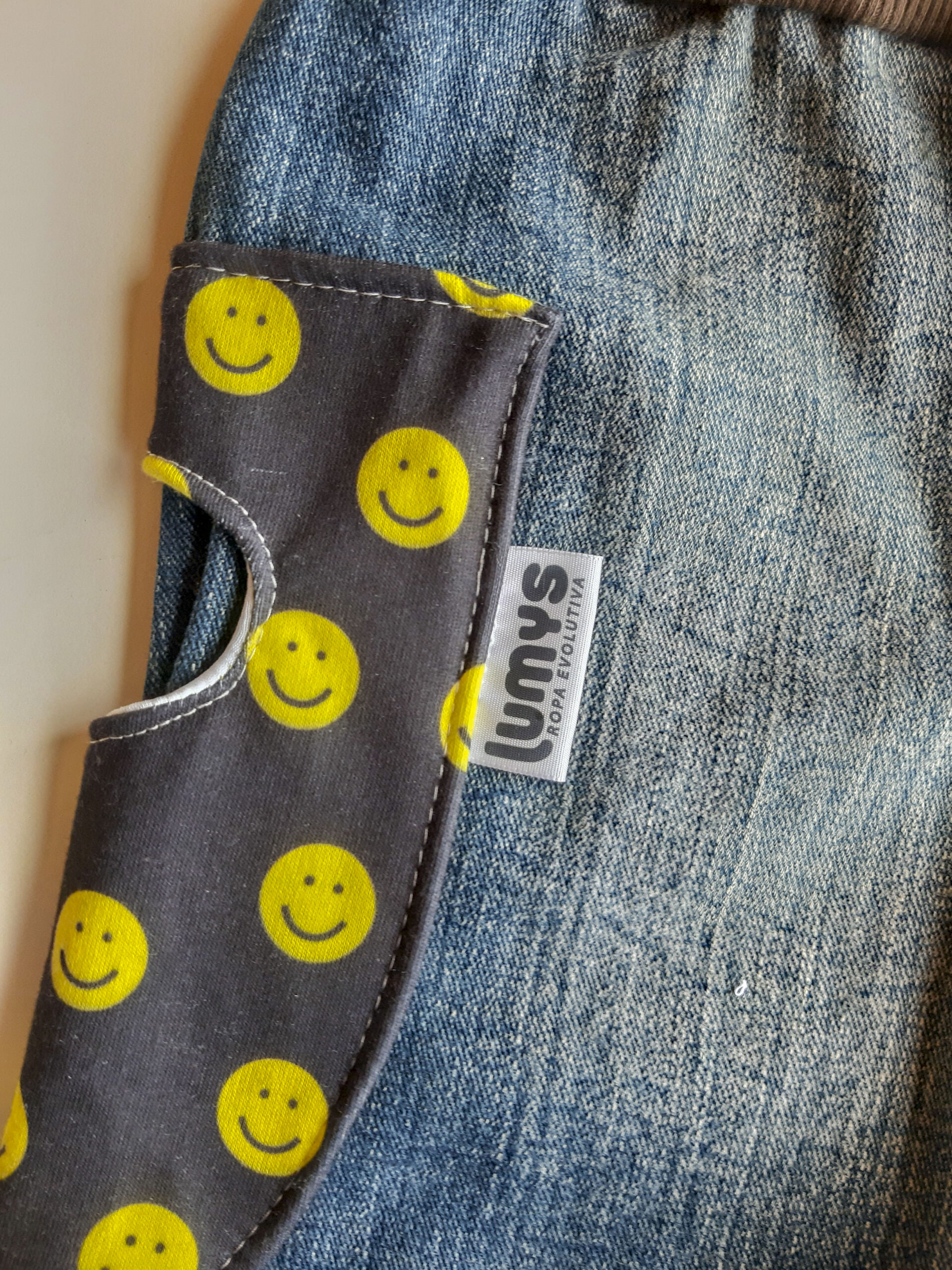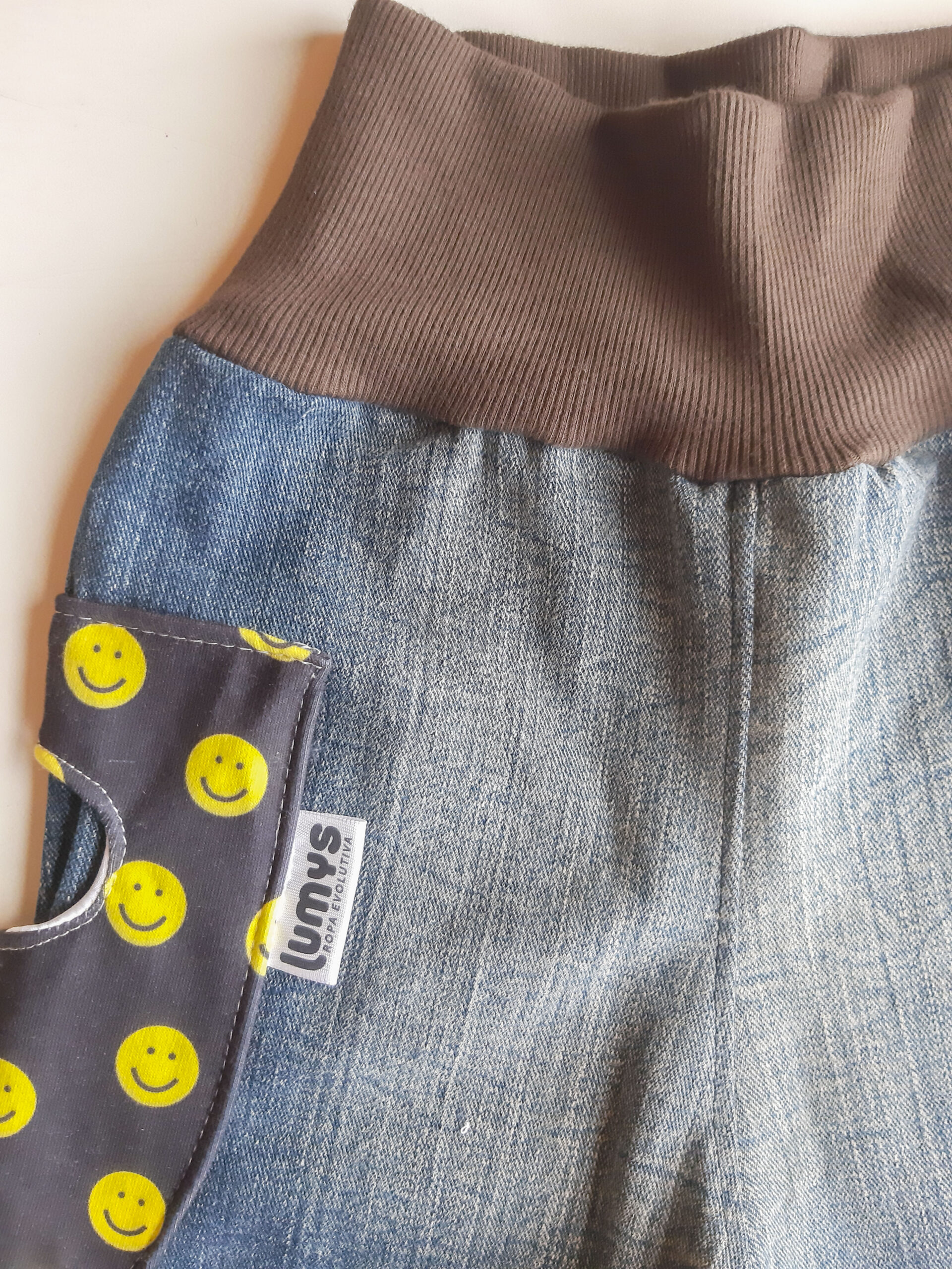 Pantalón evolutivo de diseño único hecho a partir de la re-utilización de una prenda en desuso en perfectas condiciones.