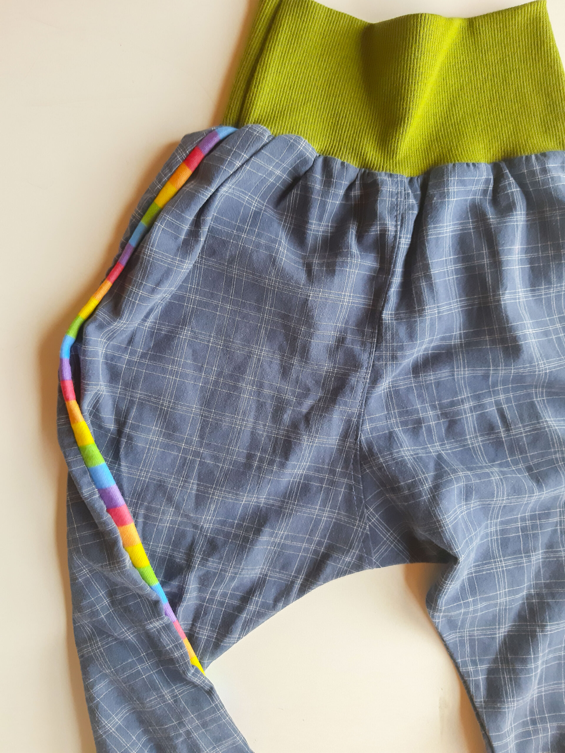 No tienen elástico, sólo puños que ajustan y no aprietan, sino todo lo contrario contienen amorosamente su pancita. Éstos mismos puños permiten que el pantalón sea evolutivo doblando y desdoblando a medida que crece tu bebé.