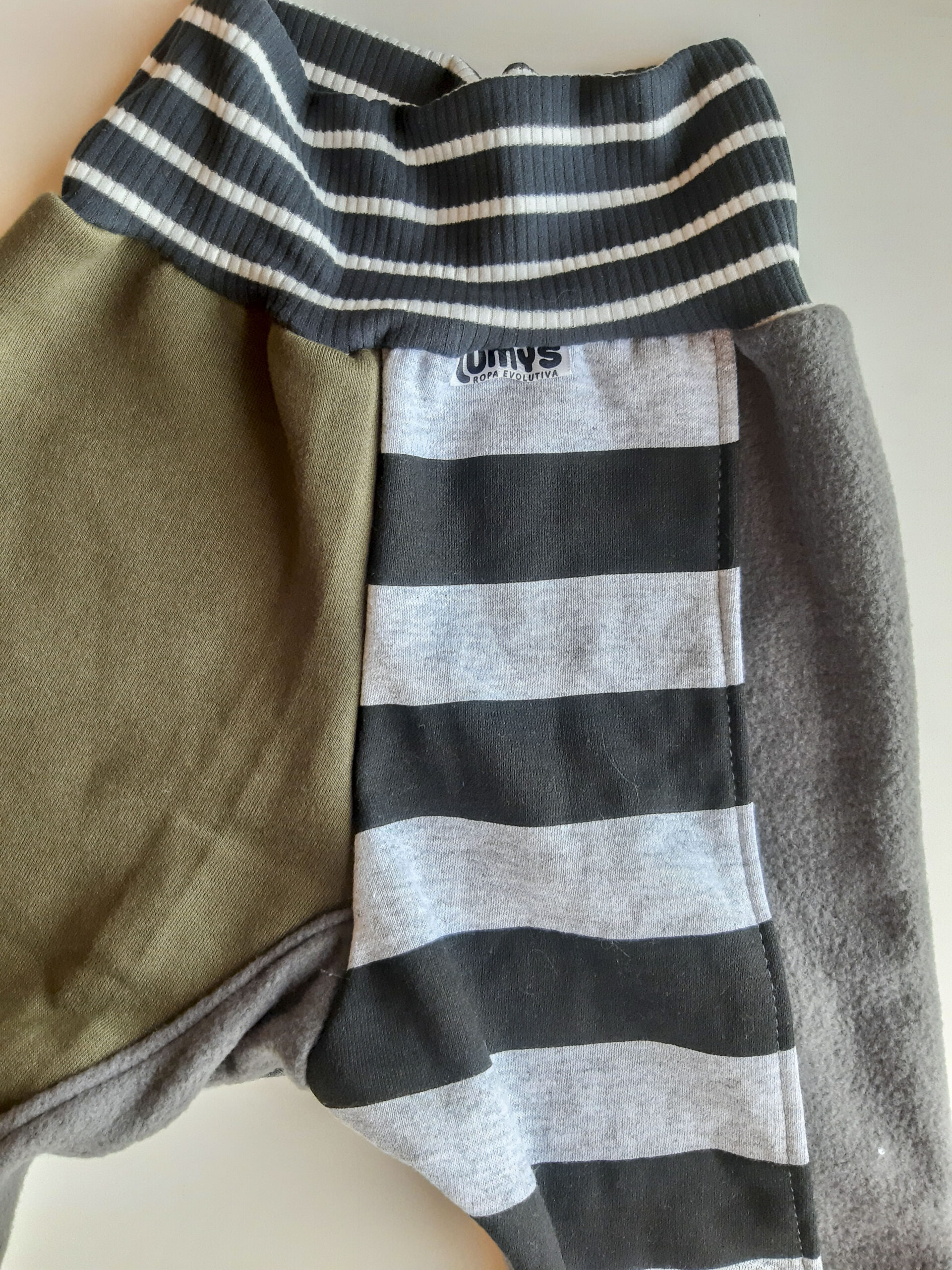 No tienen elástico, sólo puños que ajustan y no aprietan, sino todo lo contrario contienen amorosamente su pancita. Éstos mismos puños permiten que el pantalón sea evolutivo doblando y desdoblando a medida que crece tu bebé.
